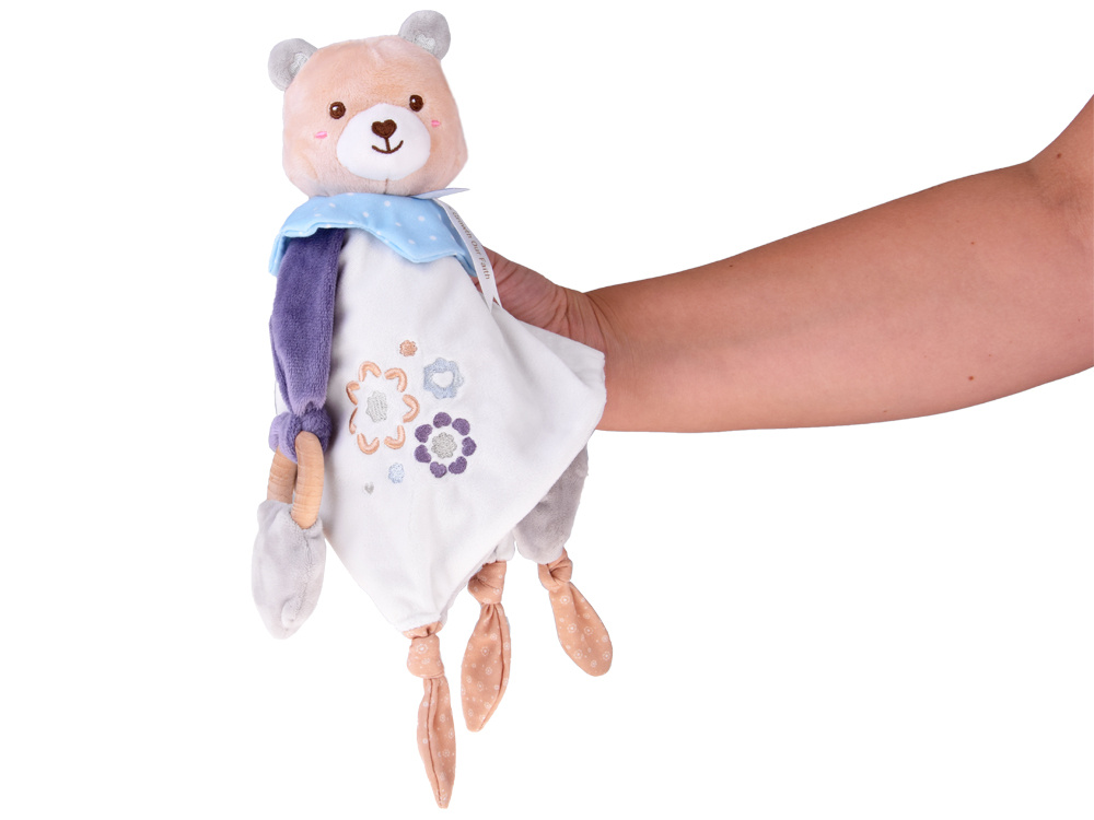 An adorable plush teddy bear with a fabric blanket, teether, knots, crinkly star, and tag is the perfect companion for your little one from the very first days of life.