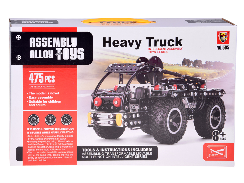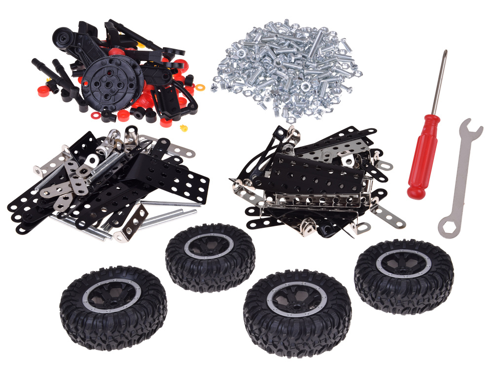 This construction set is a perfect gift idea for children, teenagers, and even adults who enjoy challenges and creative play. It consists of as many as 475 elements, mainly metal construction parts combined with plastic details and large rubber wheels. Thanks to this, the finished model is stable, durable, and looks very realistic.