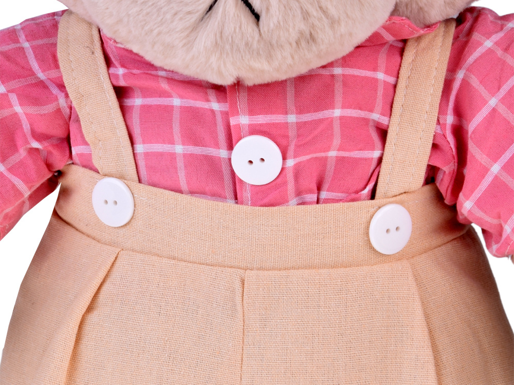 - He has a perforated brown nose and wears a pink-and-white checkered shirt. The shirt features decorative buttons that do not open, but thanks to the Velcro fastening, it can be easily removed.