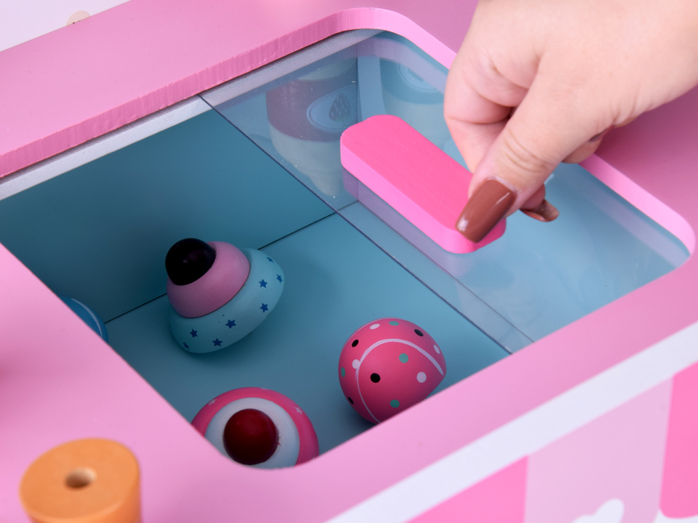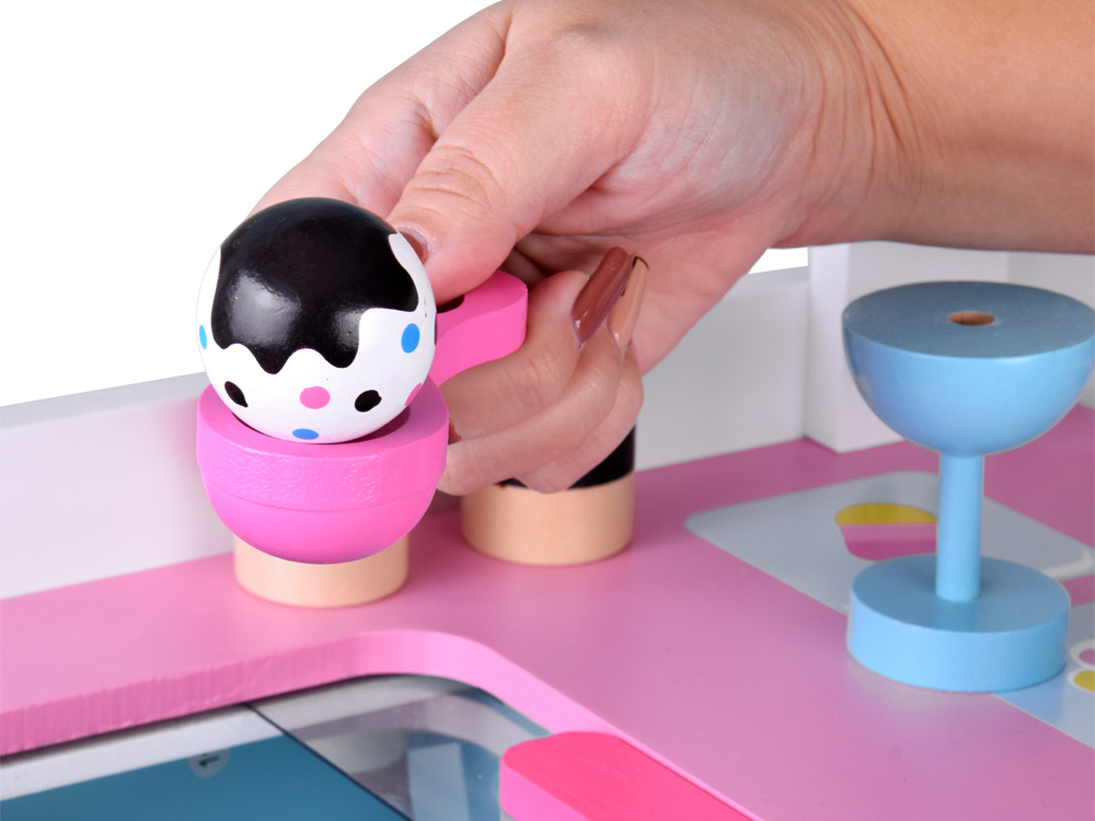 At the top, there is a large serving counter, perfect for displaying ice creams and accessories. Underneath, you’ll find a spacious storage shelf for all the sweet accessories and a sliding “freezer” compartment, ideal for keeping the toy ice creams cool – just like in a real ice cream cart!