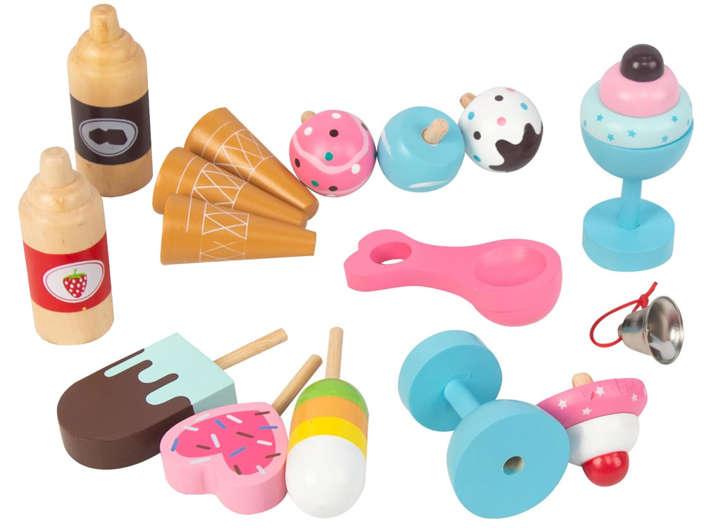 • ice cream, ice cream on a stick, in a cone, with a scoop, with a magnet, with a roof, with a handle, mini ice cream parlor, cold sweets, sweets, confectioner, ice cream stand, pastel trolley, ice cream making set