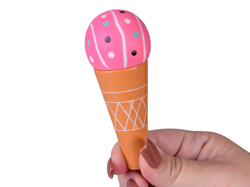 The ice creams in cones and cups can be attached with small wooden pegs, allowing kids to stack and remove the scoops easily.