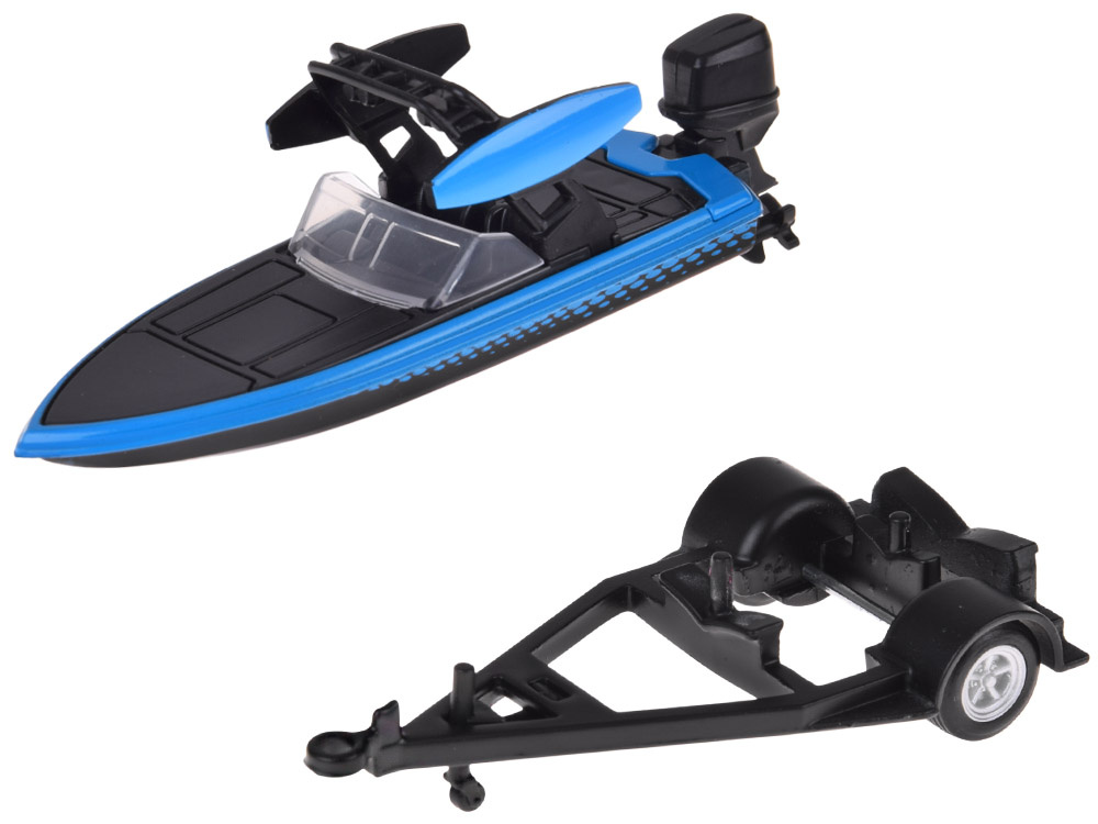 The model comes in a navy blue and black color scheme, giving it both a sporty and classic look. The Ford F-150 SVT Raptor is equipped with a hitch that allows the trailer with the boat to be attached. The hitch can be removed with a screw, and the trailer itself can be detached without unscrewing the hitch. The boat fits perfectly on the trailer, adding realism and making the set look great both on a collector’s shelf and during playtime.