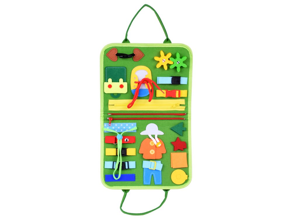 Clothing elements for fastening, unfastening, tying, and threading. Your child develops finger skills and learns independence when dressing.