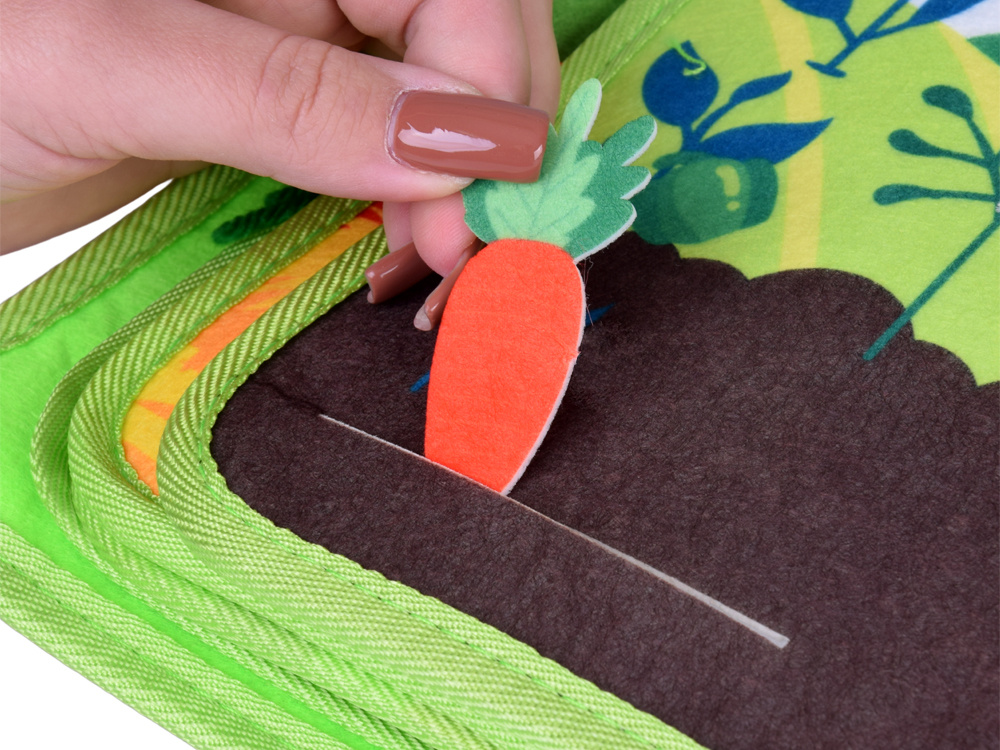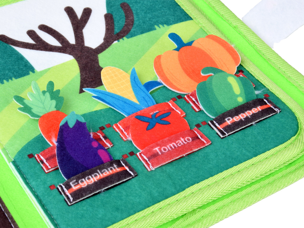 This unique educational book is made of soft felt and features turnip stickers that can be attached, detached, and rearranged endlessly.