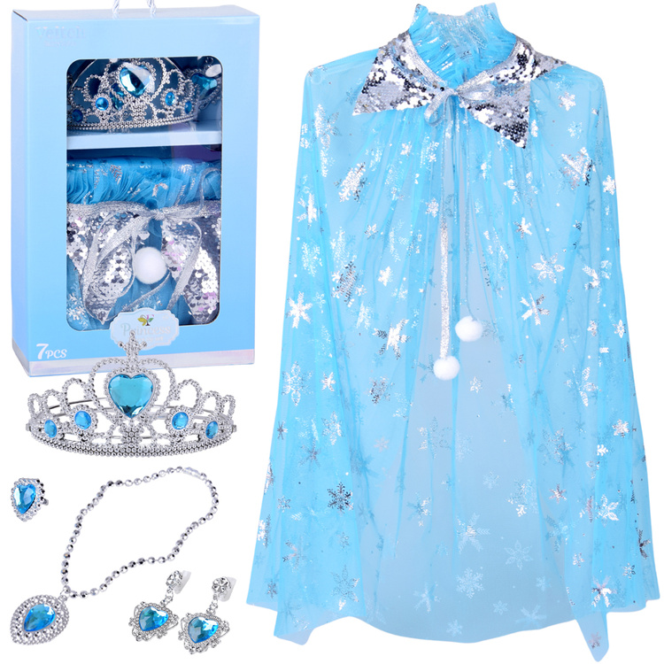 The set includes a light, sky-blue cape decorated with silver sequins and snowflakes of the same color. It ties around the neck or shoulders with two fluffy white pom-poms.