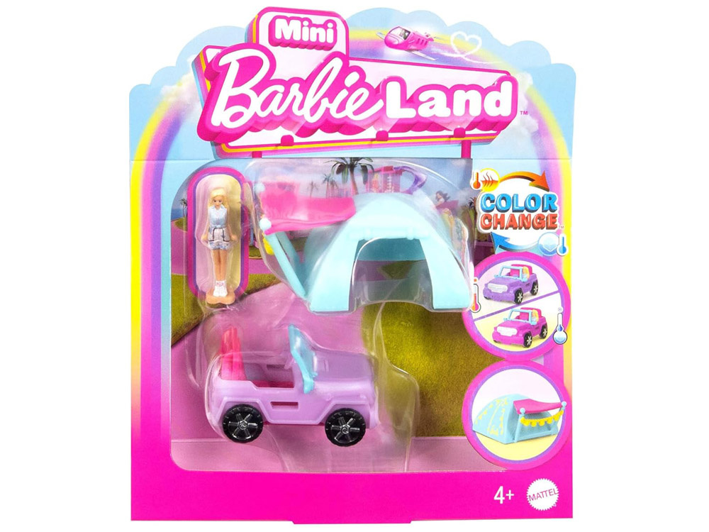 Miniaturowy zestaw z serii Mini BarbieLand: terenówka zmieniająca kolor, laleczka Barbie® (3,5 cm), namiot