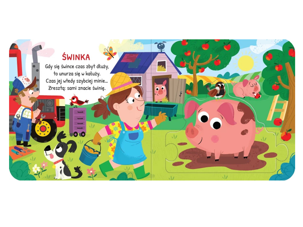 Animals on the Farm. A Puzzle Book by Bogusław Michalec is a delightful publication created especially for the youngest readers who are just beginning their adventure with books. Designed for children aged 0–3 years, the book has a convenient, sturdy cardboard format perfectly suited to small hands. Its thick pages and large removable pieces make it both durable and safe for play.