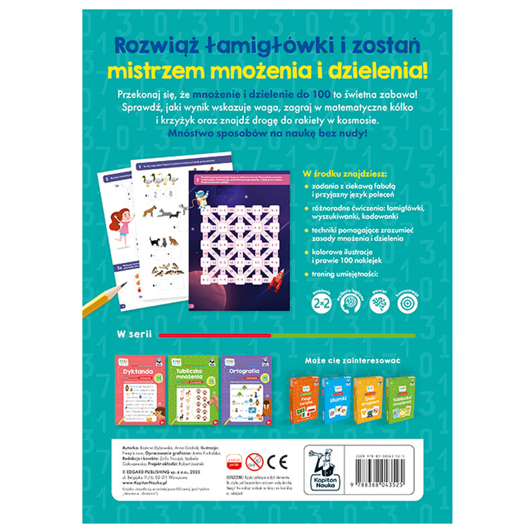 The Kapitan Nauka EDUseries. Multiplication and Division. Exercises is a practical and engaging educational book that helps children master the basics of multiplication and division in a clear, structured, and user-friendly way. A variety of exercises make math interesting, engaging, and rewarding.