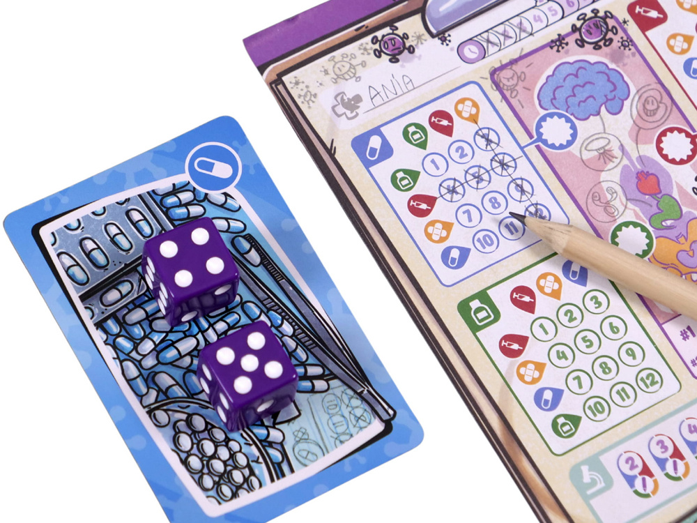 Gameplay is straightforward and quick. On your turn, you roll dice in your color, place them on available cards to perform research actions, and record the results on your sheet. The key is to optimize your results while avoiding contamination — viruses can ruin even the best-laid plans if you’re not careful.