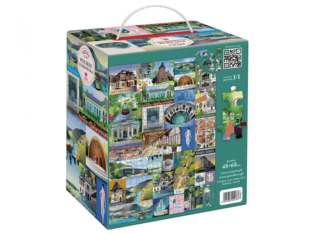 Puzzlove Polish Spa Towns is a large, beautifully designed 500-piece jigsaw puzzle filled with charming postcard-style illustrations that bring back memories and inspire new adventures. A perfect gift for grandparents, parents, or anyone who loves peaceful, picturesque places—including yourself!