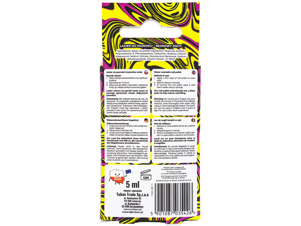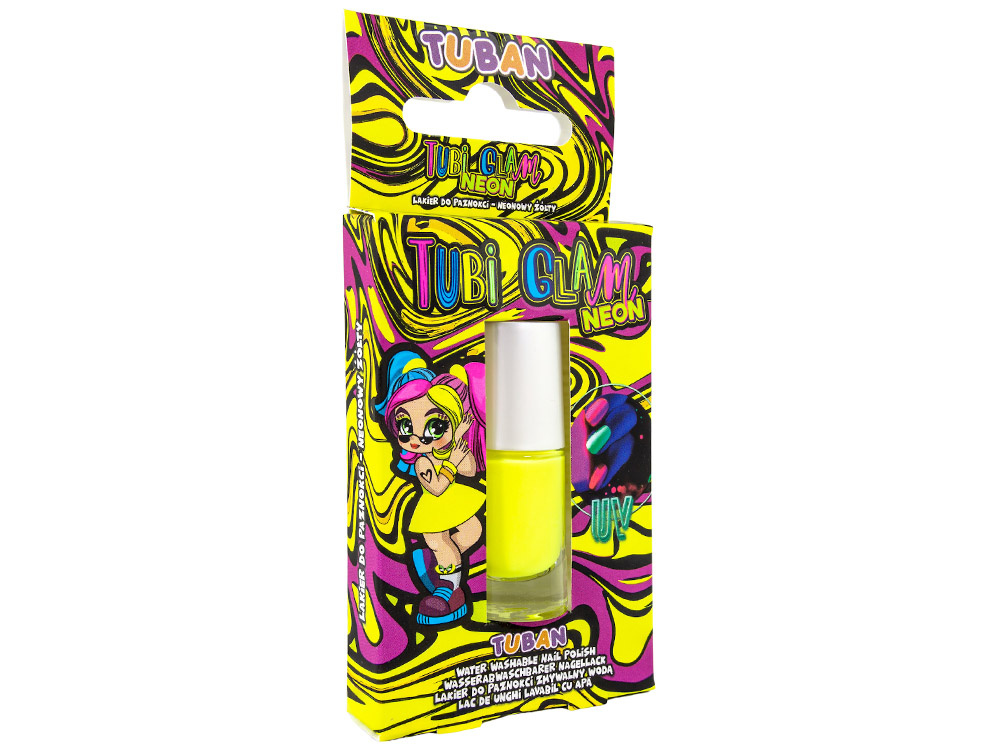 The neon version of TUBI GLAM nail polish offers not only an intense yellow color but, above all, safety of use. It was created to be 100% safe for children's delicate nail plates. Warm water and a sponge are enough to remove the polish, so your little fashionista can change her nail color even several times a day.