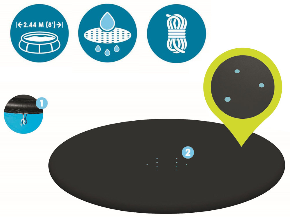 Universal Bestway pool cover that fits the circular pool with a diameter of 244cm. Protective cover pool, the pool provides protection from insects, birds, leaves and little rain. This is an additional safeguard against accidental falling into the pool of children. The cover is an additional thermal insulation of water in the pool. Through the links that enable its attachment, the wind did not break up and drain holes to effectively accompany collecting excess water. Design the cover of a very durable and strong material will allow you to use it for many seasons.