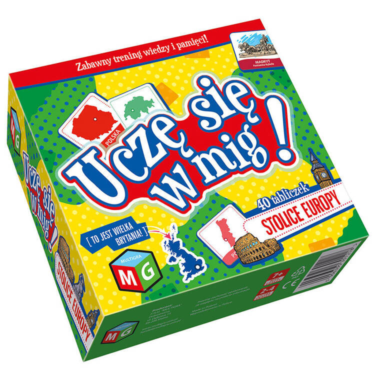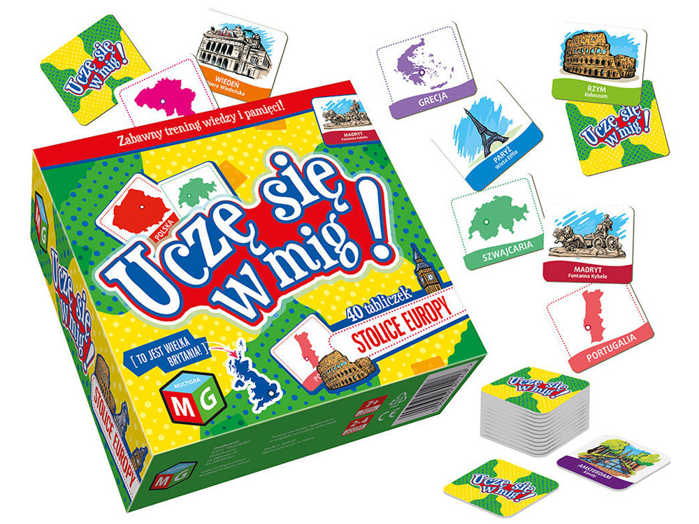"UCZĘ SIĘ W MIG - STOLICE EUROPY" to wspaniała gra, która rozwinie pamięć i spostrzegawczość Twojego dziecka. Dodatkowo poszerzy jego wiedzę z zakresu geografii i pomoże obudzić w nim naturę prawdziwego podróżnika zapewniając przy tym dużo dobrej zabawy i emocji. W grze wygrywa ten, kto najlepiej zapamięta położenie par państw i ich stolic, odkrytych na chwilę, spośród wszystkich ilustrowanych tabliczek leżących na stole rewersem do góry.