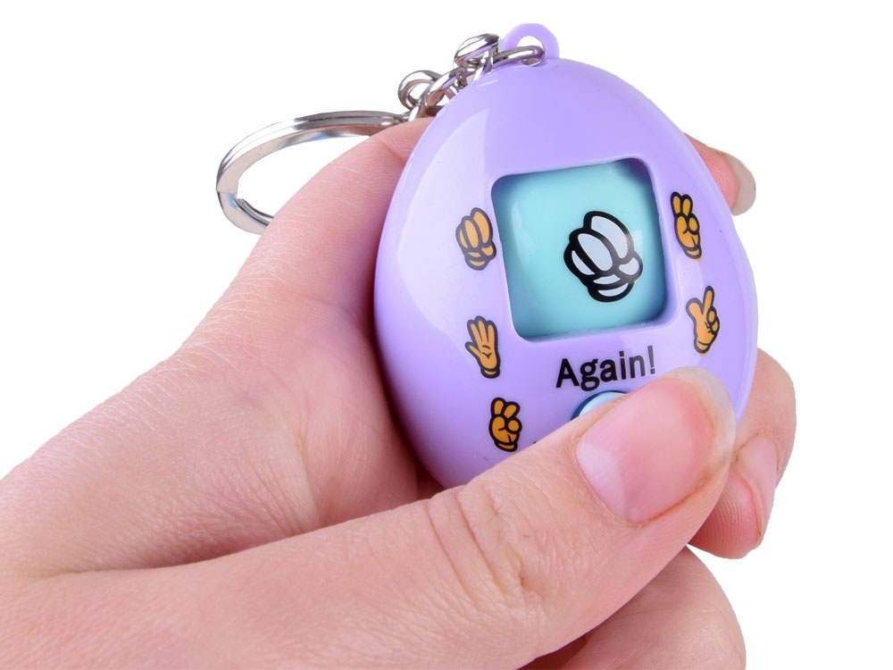 A colorful, egg-shaped key ring with a game will be perfect for a school backpack or purse. The key ring has a built-in popular game "rock, paper, scissors", all you need to do is press a button and the spinning handle will show you the sign. A cool gadget will work while waiting for the bus or taking a bet with a friend.