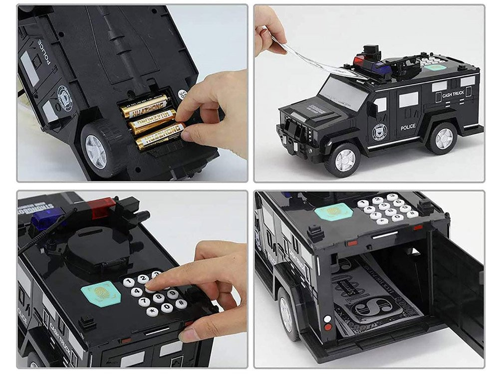 Policyjny samochód skarbonka to auto do zadań specjalnych. Auto z efektami dźwiękowymi za swoje zadanie ma chronienie i przetrzymywanie oszczędności dziecka. To auto spełnia te wymagania. Autko policja posiada kod dostępu, automatycznie otwierane drzwi po zeskanowaniu odcisków palca, w aucie kryją się też niesamowite efekty dźwiękowe. Auto policja niby zabawka a tak naprawdę to sejf dla Twojej kasy : )