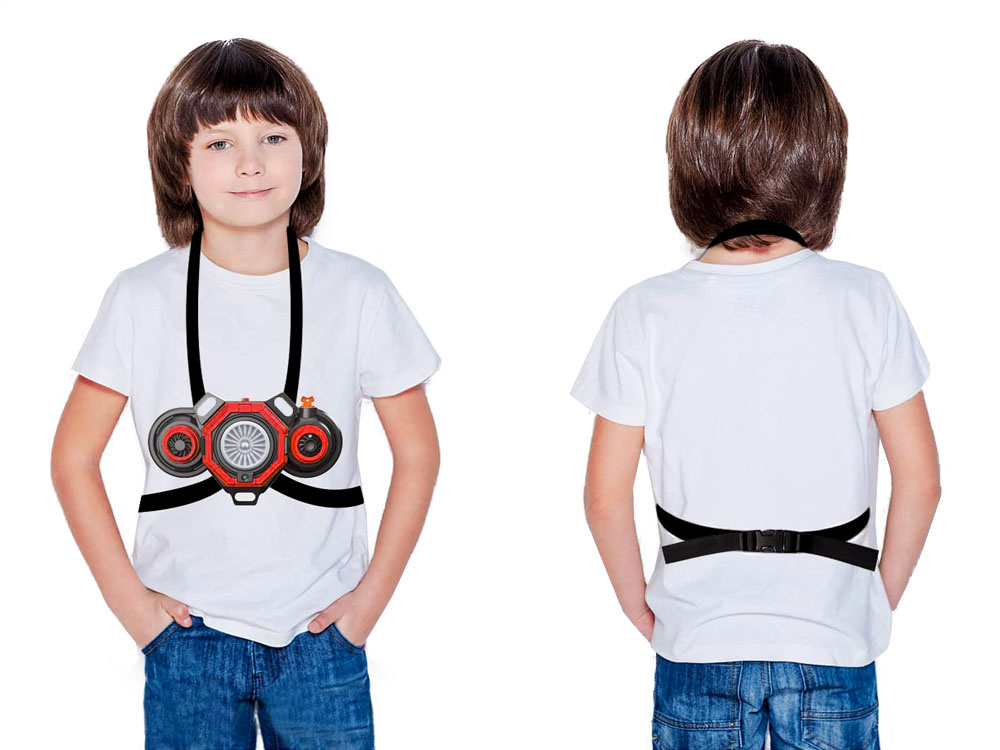 Następnie należy uruchomić kamizelkę- celownik, skierować pistolet w jego środek i nacisnąć spust, by sparować urządzenia. Gdy środek celownika świeci tym samym, stałym kolorem, co pistolet, oznacza, że broń została poprawnie sparowana. Kamizelkę zakłada się na tułów za pomocą regulowanych opasek.