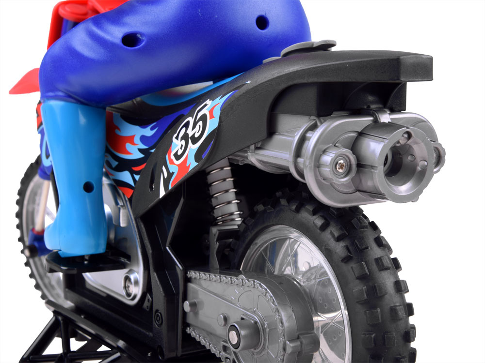 Motor terenowy typu CROSS z motocyklistą na pilota zapewne sprawi radość każdemu miłośnikowi sportów ekstremalnych. Motor wykonany jest z elementów plastikowych, posiada amortyzowane tylne i przednie koła oraz gumowe opony. Motor jest bardzo starannie i estetycznie wykonany. Cross posiada realistyczne dźwięki, ale to nie wszystko. Po nalaniu wody do baku podczas jazdy w rurze wydechowej zacznie mrugać zielone światełko oraz wydobywać się dym, co sprawi że zabawa będzie bardziej realistyczna. Motor wyposażony został w podnóżek z kółkami, pozwalający na stabilną jazdę.