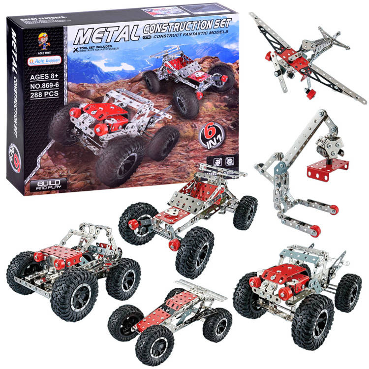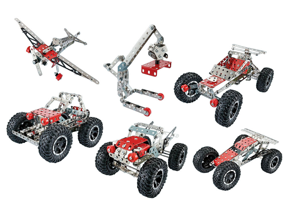 Metalowe klocki konstrukcyjne to idealna propozycja dla każdego małego majsterkowicza czy technika. Zestaw metalowych elementów o różnych kształtach pozwoli na zbudowanie terenowego samochodu, wyścigówki czy samolotu. Oczywiście zmiana koncepcji jest mile widziana, wszystko zależy od wyobraźni i umiejętności dziecka.