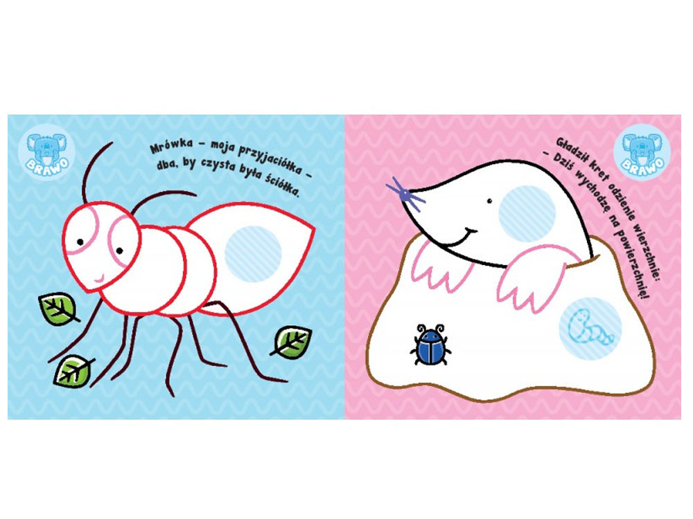 Książeczka została zaprojektowana tak, by bawić się z maluchem oraz rozwijać jego umiejętności. Znajdziemy w niej krótkie wierszyki, 32 kolorowe naklejki oraz papierową zabawkę do samodzielnego złożenia.