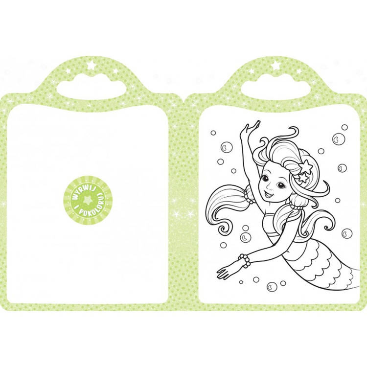 format: | A4; ilustracje barwne; gruby papier; brokat na okładce; perforacja; dołączona tęczowa kredka |