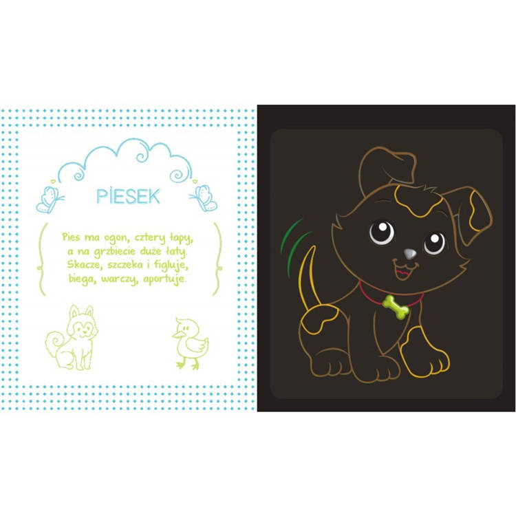 Użyj rysika jak magicznej różdżki, a na pokrytych czernią stronach wyczarujesz kolorowy świat zwierząt, pojazdów i bajkowych postaci.