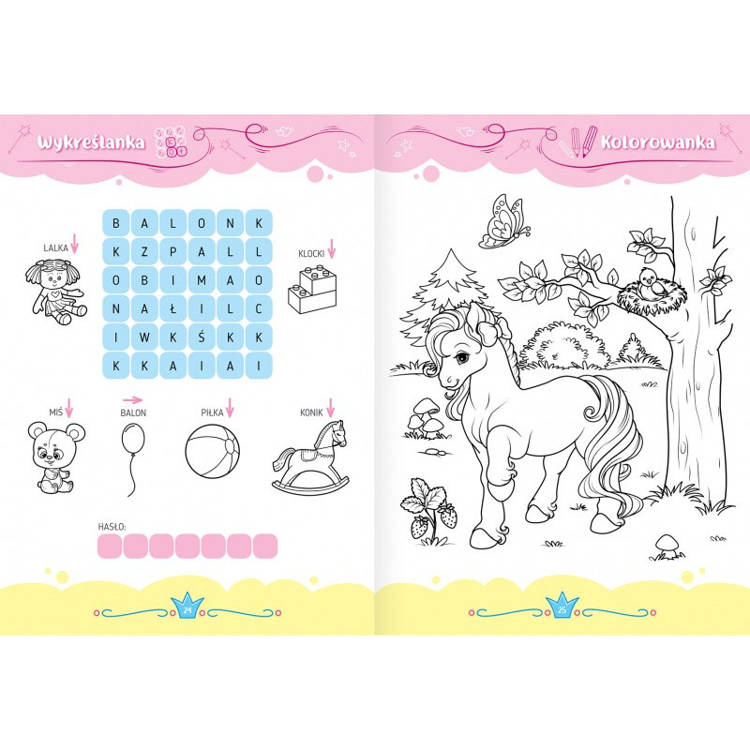 „Słodkie kucyki. Aktywizująca książeczka dla dziewczynek” to zbiór zajmujących łamigłówek oraz kolorowanek do ciekawego spędzania czasu i rozwijania wielu przydatnych umiejętności.