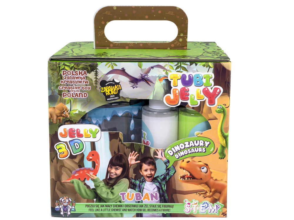 Tubi Jelly Dinozaury to najnowsza propozycja od Firmy Tuban na stworzenie żelowych prehistorycznych stworzeń. Więc poczuj się jak mały chemik i stwórz swoją własną kolekcję dinozaurów. Żelowe płyny TUBI JELLY mają niezwykłą moc. Stworzone z nich kształty zamieniają się w trójwymiarowe figurki. Wystarczy tylko, że namalujesz wybrany kształt dinozaura na dołączonej do zestawu folijce, albo stworzyć własnego, oryginalnego dinozaura. Potem włóż go na kilka chwil do pojemnika z rozpuszczonym aktywatorem i obserwuj,
