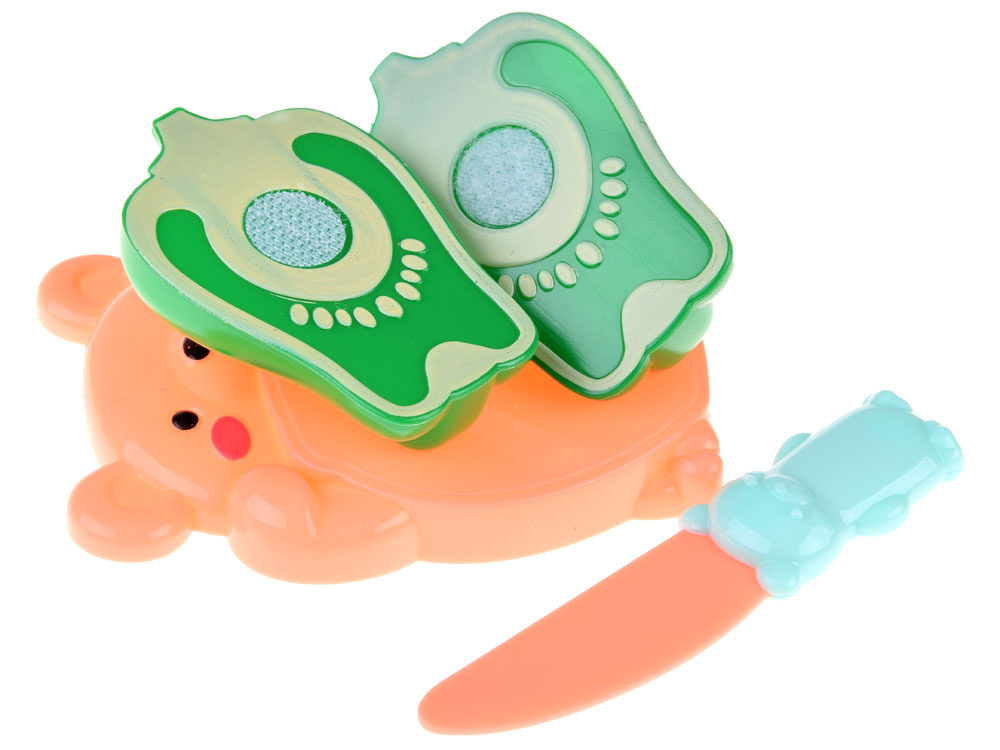 Vegetables/fruits are also plastic in attractive colors. They are connected by a kneecap, so the child will be able to play cutting them.