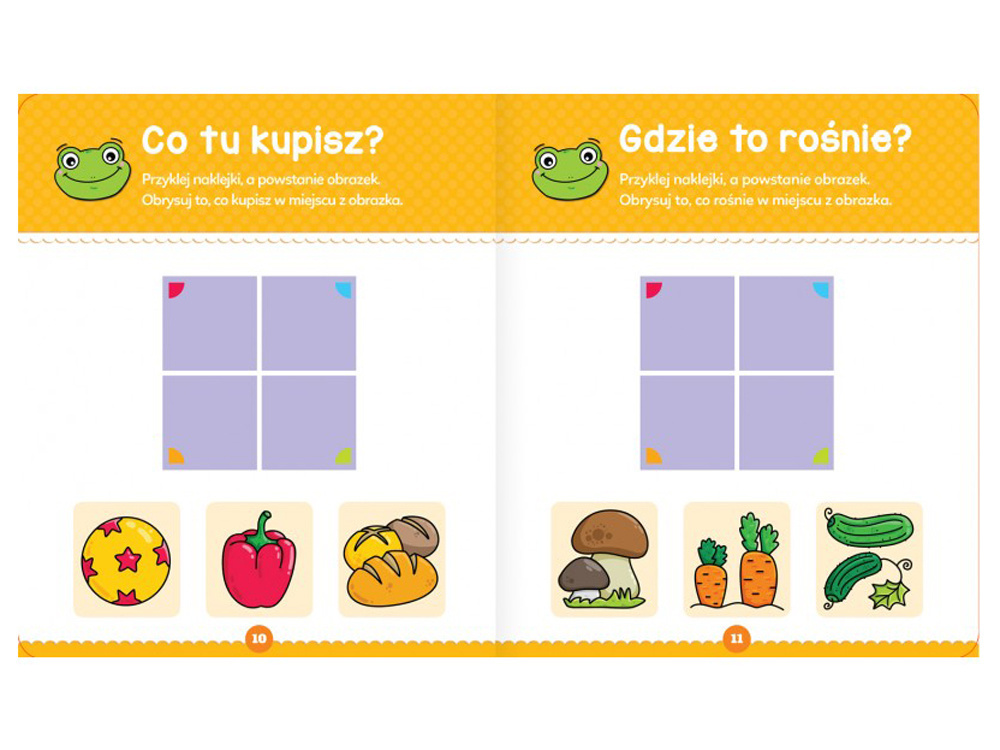 Zamieszczone zadania mają charakter quizu. Zanim jednak dziecko wskaże właściwą odpowiedź, najpierw musi przykleić cztery naklejki tworzące obrazek. Naklejki oznaczone są numerem strony. Kolorowe oznaczenia w rogach wskazują, w którym miejscu na stronie należy przykleić każdą z naklejek.