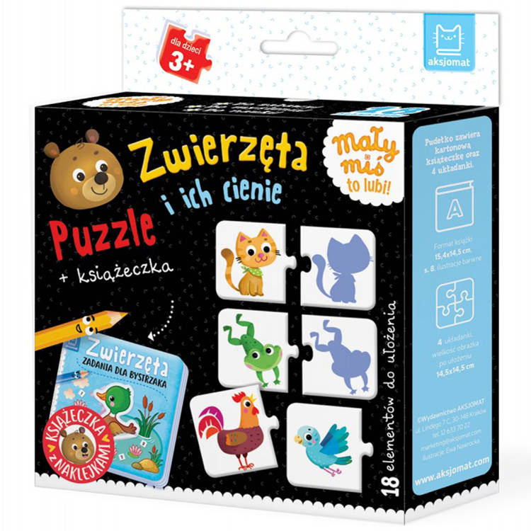 - 18 elementowych puzzli, zabawa polega na dopasowaniu zwierzątka i jego cienia,