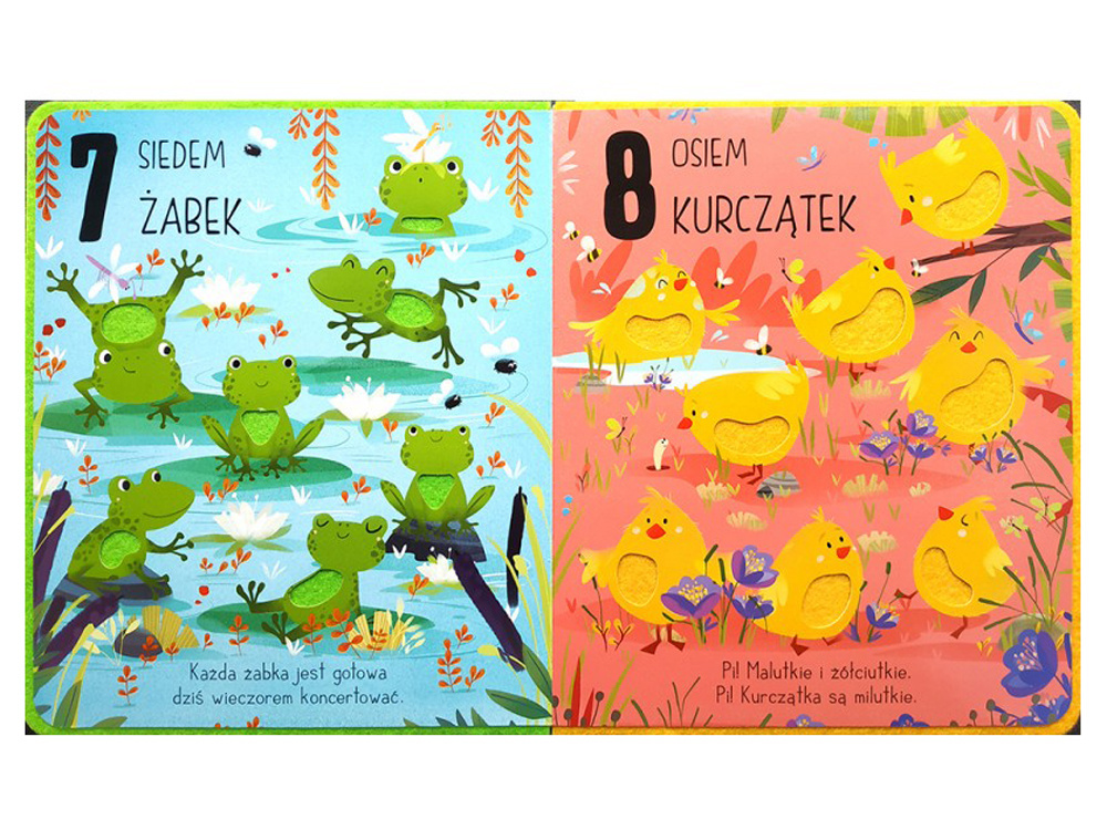 Na każdej stronie znajdziemy obrazek z innymi zwierzątkami, opatrzony odpowiednią liczbą oraz krótki wierszyk. Podczas wspólnej zabawy dziecko uczy się kolorów, liczenia a dotykanie miękkiego filcu dodatkowo stymuluje zmysły.