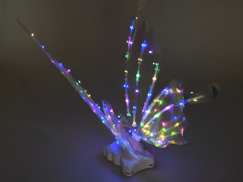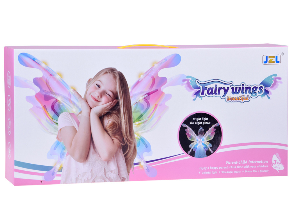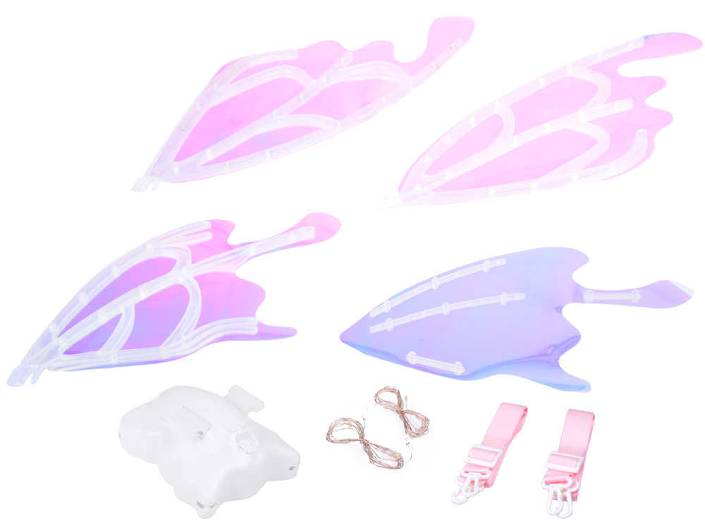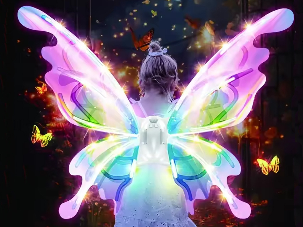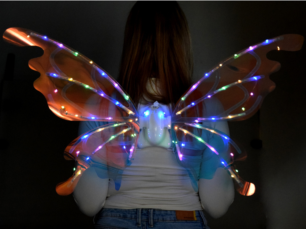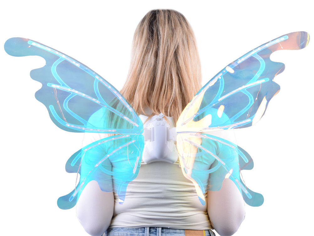 Kształtem przypominają olbrzymie skrzydła motyla, które w zależności od kąta padania światła - mienią się na wiele kolorów. Do podkreślenia efektu zostały wyposażone w oświetlenie led, co daje niesamowity efekt! Małe dziewczynki mogą poczuć się jak prawdziwe wróżki z krainy magii i czarów.
