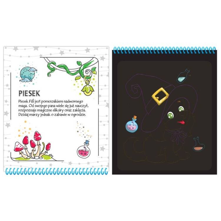 Na stronach notesu znajdziemy 10 tajemniczych stworzeń oraz ich krótką charakterystykę. Wystarczy użyć rysika jak magicznej różdżki, a odkryjesz kolorowy świat magicznych zwierząt ukryty na pokrytych czernią stronach.