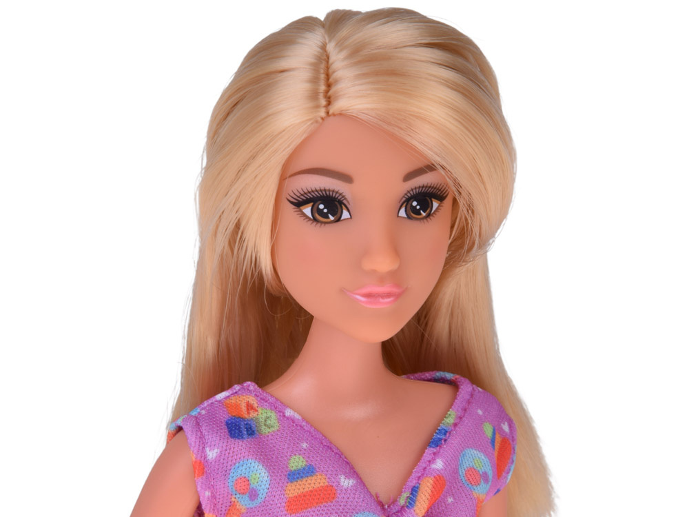 Lalka- mama ma długie blond włosy. Ubrana jest we wzorzystą sukienkę oraz buty na wysokim obcasie. Tata ma włosy z tworzywa sztucznego, nosi sportową, żółtą koszulę w kratek, jeansy oraz białe sneakersy. Córeczka również ma długie, jasne włosy. Ubrana jest w żółtą sukienkę i różowe sportowe buty. Chłopiec ma jasne włosy (z tworzywa), niebieski T-shirt, brązowe spodenki oraz pasujące buty.