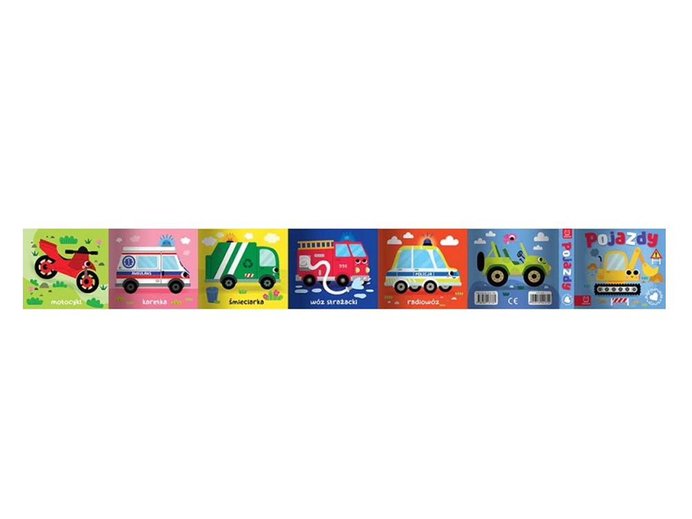 Książeczka przedstawia pojazdy jakie spotkamy na drodze np. : straż, pogotowie czy skuter. Książeczka jest składana w formie harmonijki , dzięki małym wymiarom możemy ją łatwo schować czy zabrać ze sobą na wycieczkę.