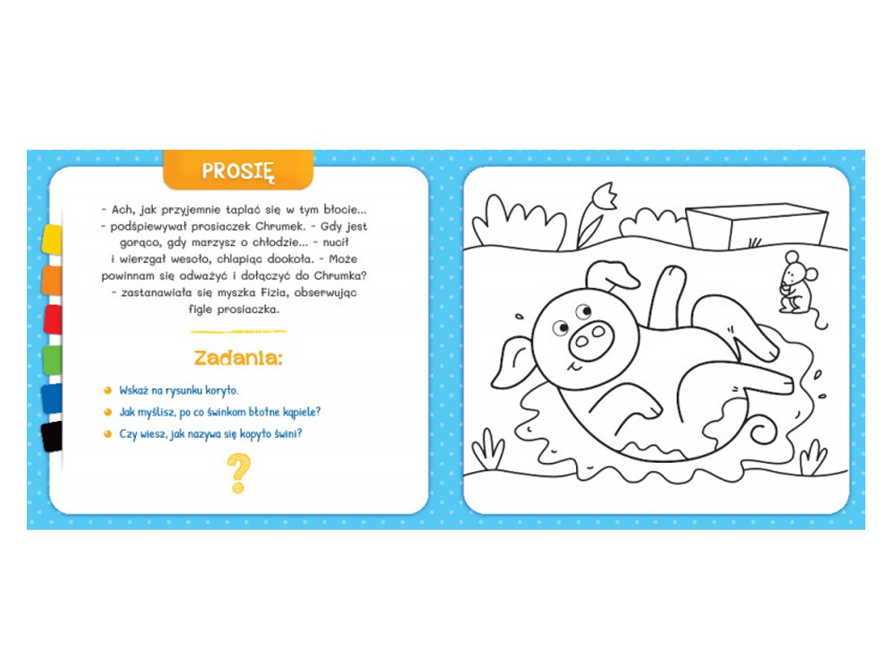 Dodatkową atrakcją książeczki jest dołączona kredka segmentowa w podstawowych kolorach.