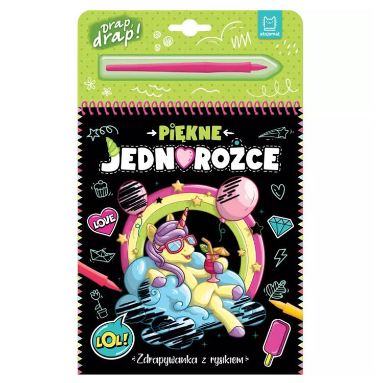 Kolorowa, tęczowa zdrapywanka z pięknymi jednorożcami zamknięta w poręcznym notesie z 20 kartkami, zapewni każdemu dziecku kreatywnie spędzony czas.