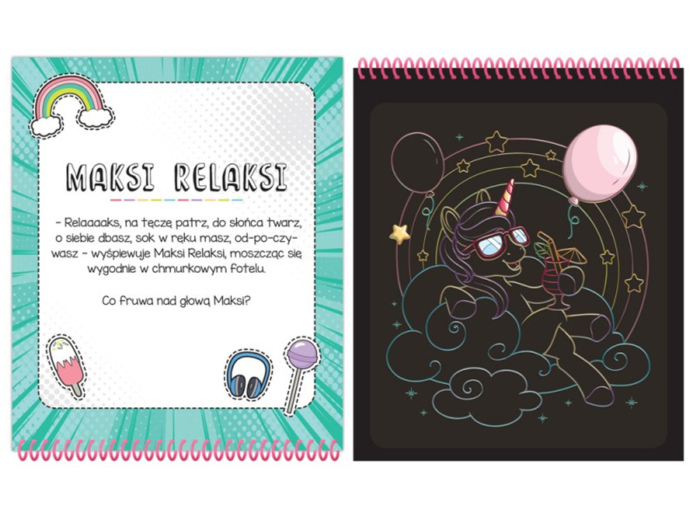 Na stronach notesu znajdziemy 10 pięknych jednorożców oraz ich krótką charakterystykę. Wystarczy użyć rysika jak magicznej różdżki, a odkryjesz kolorowy świat tych uroczych zwierząt ukryty na pokrytych czernią stronach.