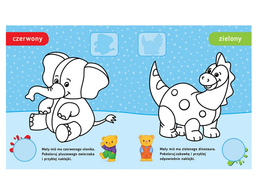 Książeczki, dostosowane do wieku dziecka, zawierają odpowiednie dla malucha obrazki do pokolorowania oraz duże kolorowe naklejki.