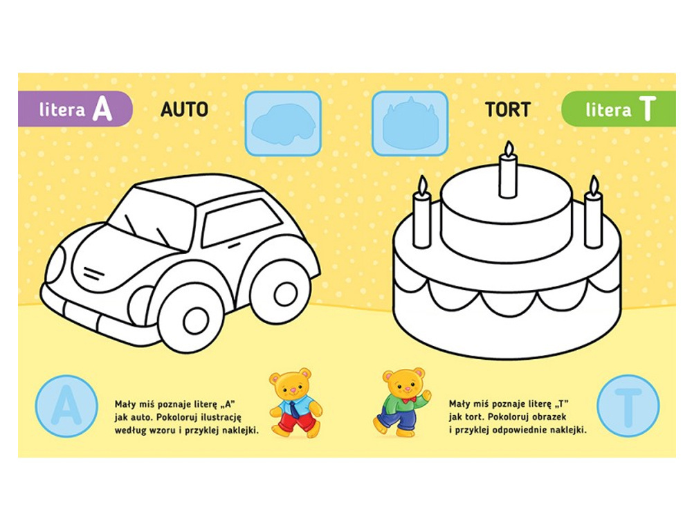 Książeczki, dostosowane do wieku dziecka, zawierają odpowiednie dla malucha obrazki do pokolorowania oraz duże kolorowe naklejki.