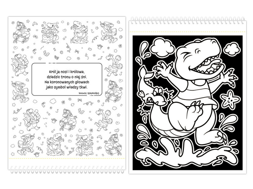 Ich tło pokryte jest czarnym welurem, którego zadaniem jest podkreślenie głębi kolorów i organicznie wychodzenia za linię. Do kolorowanki dołączone są pisaki. Wesołe dinozaury  zachęcają do kolorowania.  Spotkamy tam np: dinozaura baletnice, dinozaura w skateparku czy dinozaura otwierającego słodki prezent. Prócz ciekawych ilustracji czekają na Was zagadki.