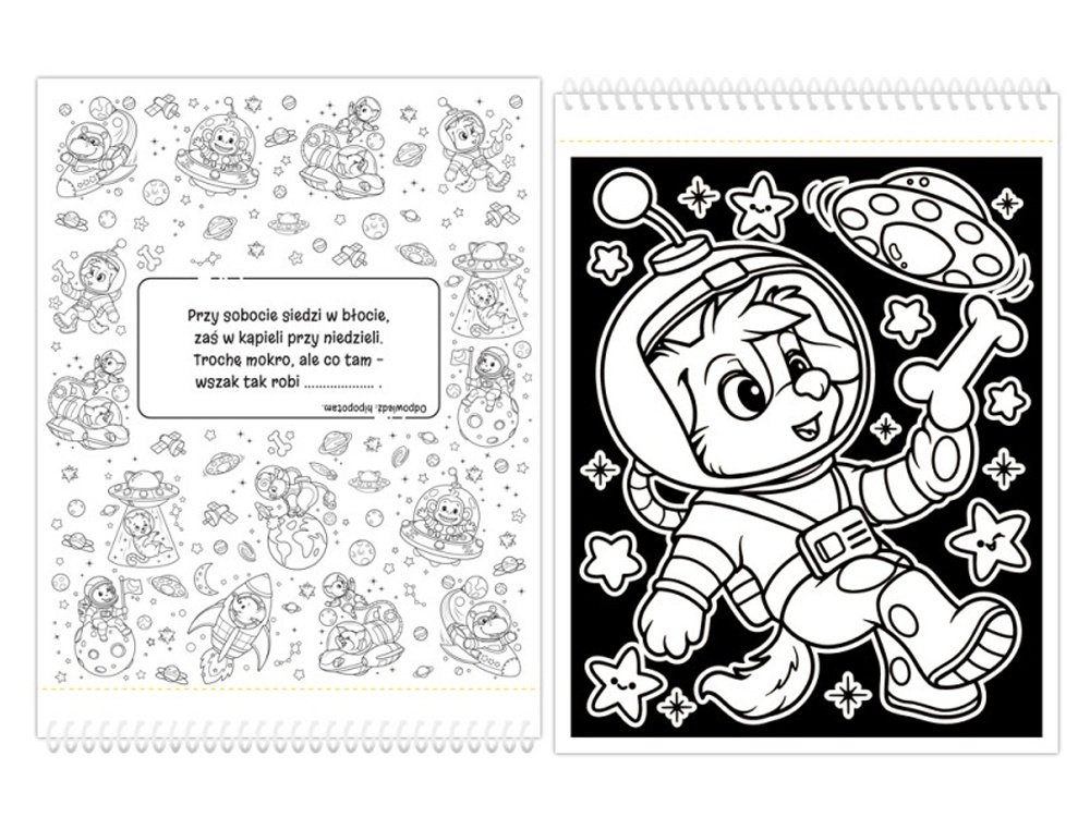 Ich tło pokryte jest czarnym welurem, którego zadaniem jest podkreślenie głębi kolorów i organicznie wychodzenia za linię Do kolorowanki dołączone są pisaki. Wesołe zwierzaki-astronauci zachęcają do kolorowania. Poznaj ich wszystkich ! :) Prócz ciekawych ilustracji czekają na Was zagadki.