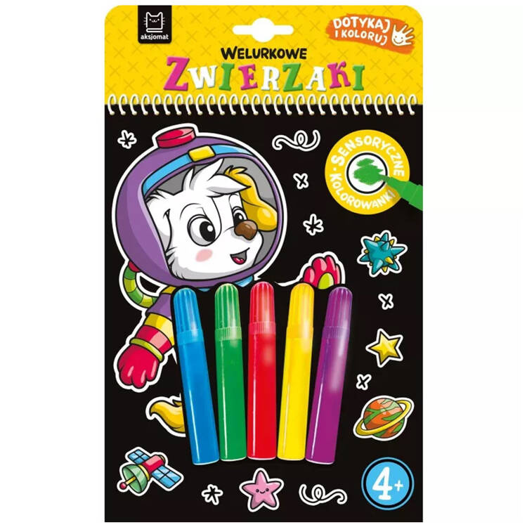 format: | 16 x 27 cm; strony pokryte przyjemnym w dotyku i ułatwiającym kolorowanie welurem, perforacja, ilustracje czarno-białe, spirala, dołączone flamastry |
