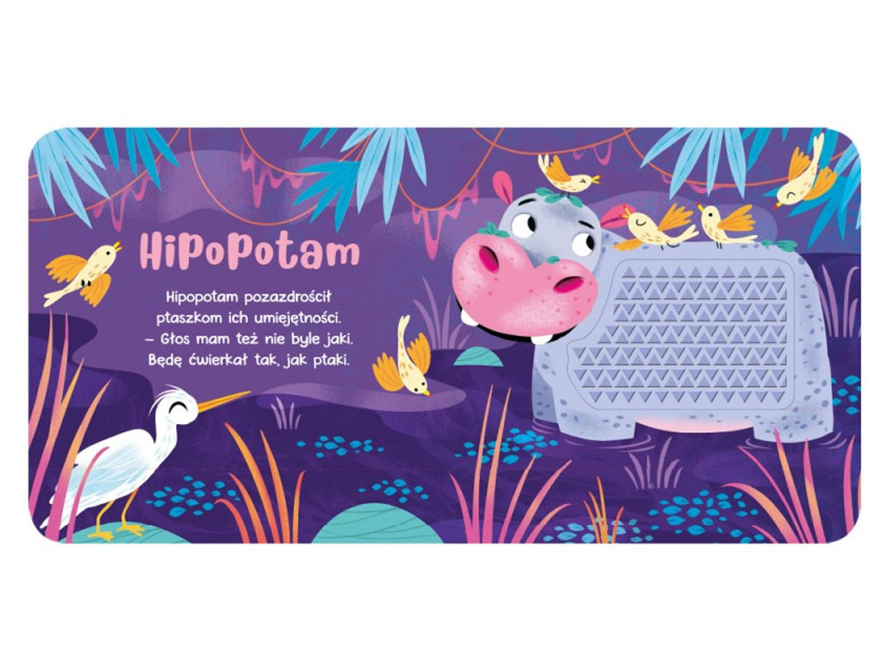 W tej książeczce zwierzątka ożywają – czy masz ochotę ich dotknąć? Czekają tu kolorowe ilustracje z silikonowymi elementami, które stymulują zmysły i zapewniają interaktywną zabawę. Każda strona ma swój unikalny wzór, co sprawia, że dotykanie każdej z postaci to wyjątkowe doświadczenie. Silikonowe wkładki nie tylko bawią, ale także wspierają prawidłowy rozwój mózgu dziecka. Dodatkowo, książeczka zawiera zabawne wierszyki opisujące bohaterów, takich jak flamingi, słoń, zebra, krokodyl czy hipopotam, co czyni ją jeszcze bardziej atrakcyjną i angażującą.