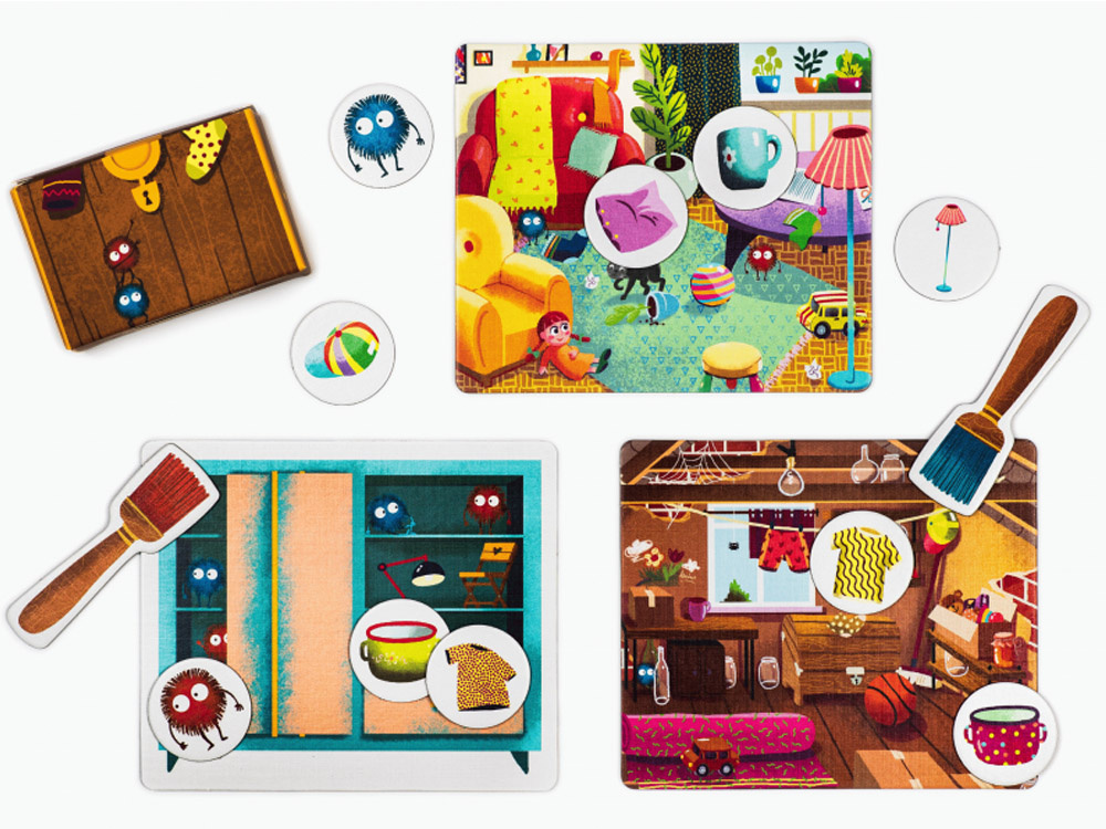 Opakowanie zawiera 4 dwustronne plansze, 40 żetonów z przedmiotami w 10 rodzajach.