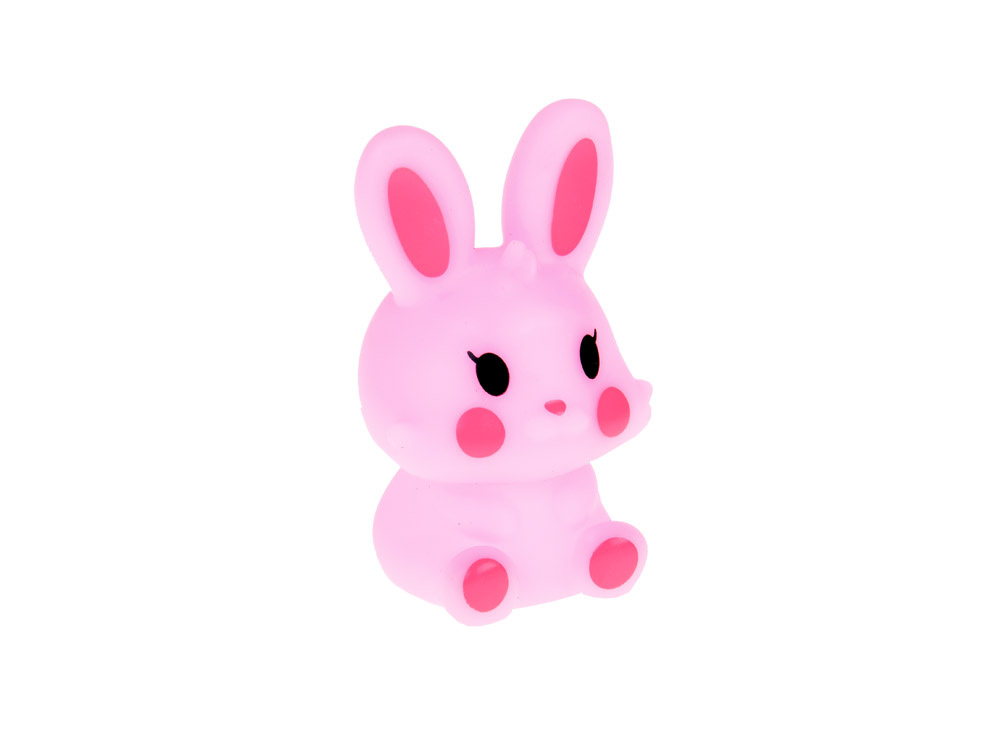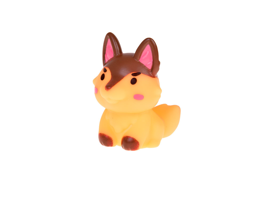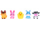 - 5 gumowych figurek zwierząt z zoo, każda w innym kolorze (królik, krowa, pies, kaczka, osioł) o wymiarach około 5 cm x 4 cm x 4 cm