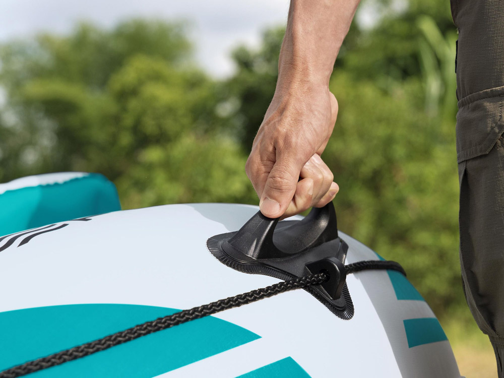 Zestaw zawiera solidne wiosła oraz wbudowane uchwyty na wędki, dzięki czemu możesz cieszyć się pływaniem i łowieniem ryb. Dzięki zatrzaskowym klamrom, wiosła pozostaną na miejscu podczas wodnych eskapad. Tratwa zawiera przelotki mocowania silnika do użytku z mocowaniem silnika o mocy 1,5 HP (1,1 kW) (silnik i mocowanie silnika nie są dołączone).