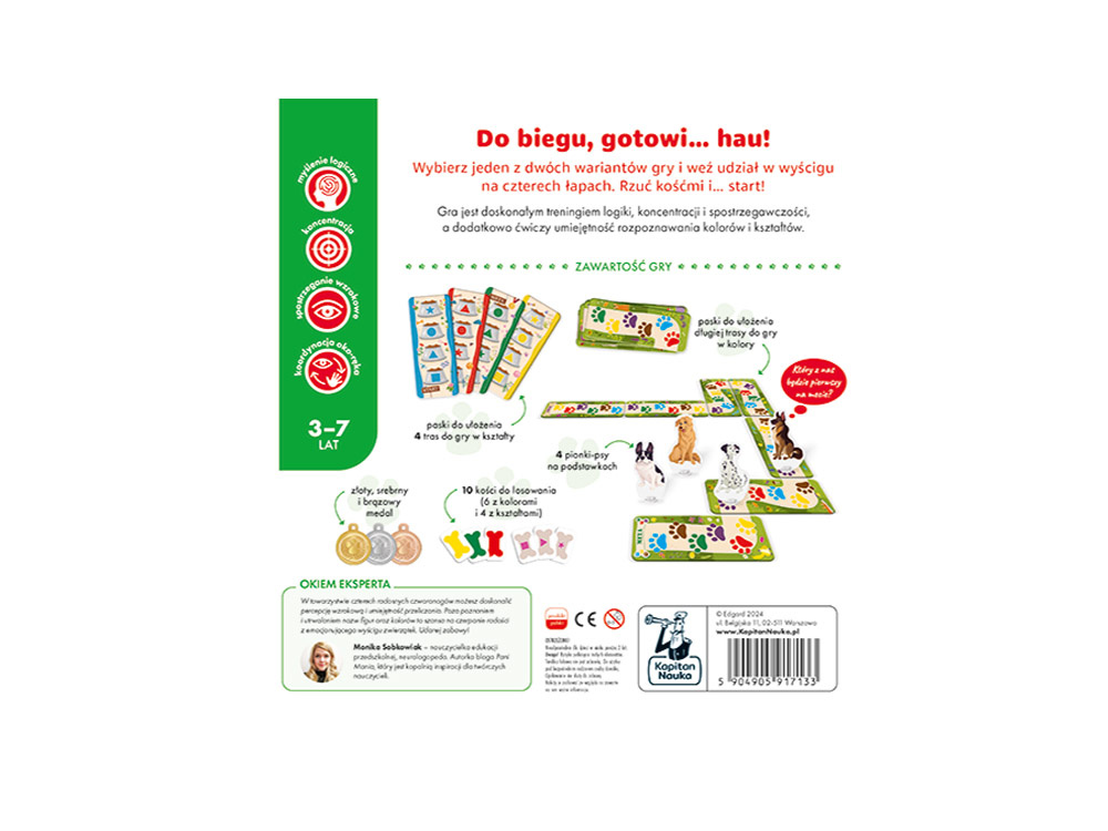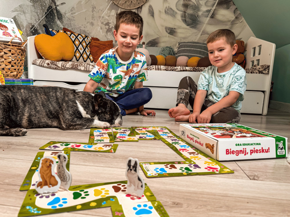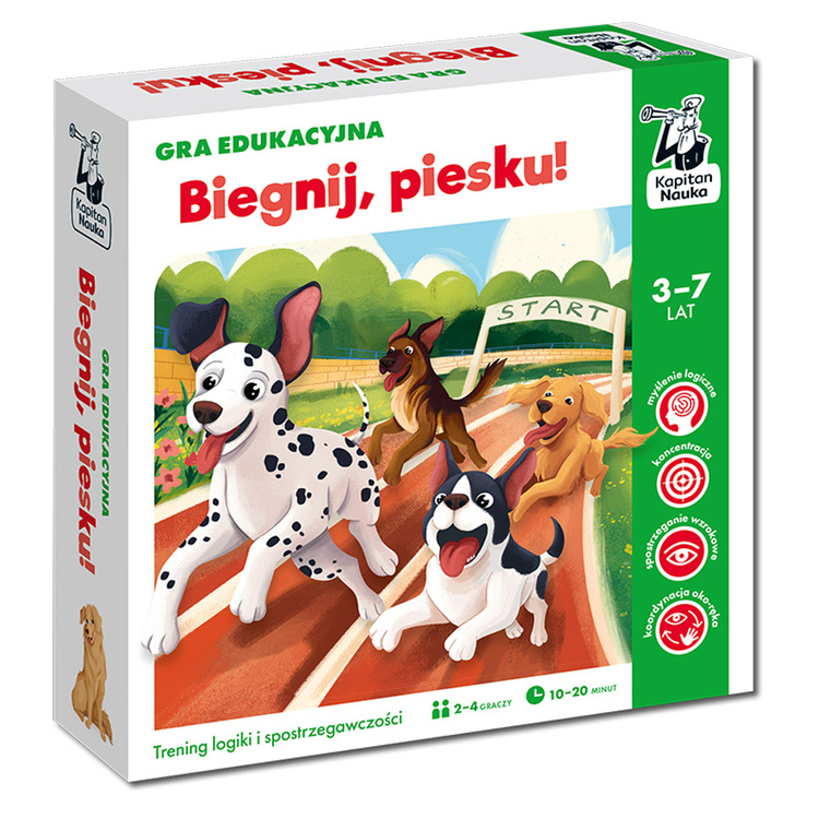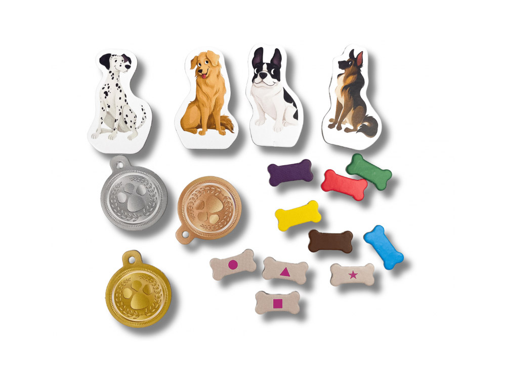 To świetna gra dla dzieci, która uczy logicznego myślenia, koncentracji, spostrzegawczości oraz koordynacji oko-ręka. Gra polega na wylosowaniu kości, które wskazują pola, na które może się udać dany piesek. Zadaniem gracza jest wybrać to pole, które gwarantuje najlepszą pozycję i pomaga przesunąć się na czoło wyścigu.