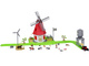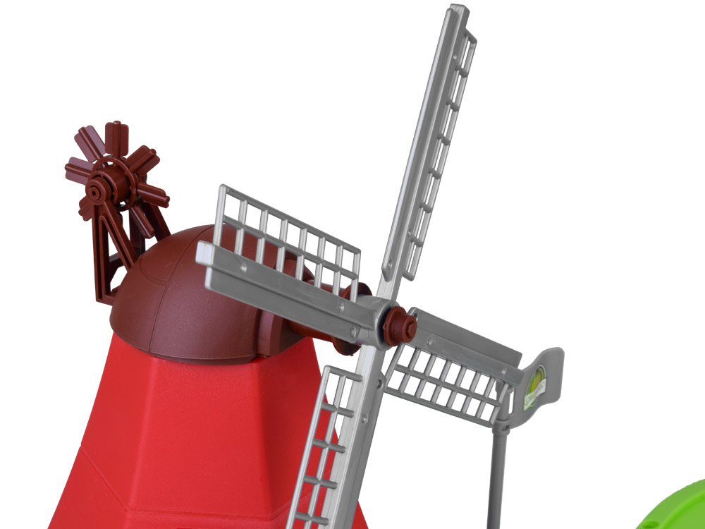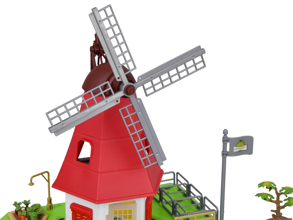 Głównym elementem zestawu jest dwupiętrowy młyn. Do budynku prowadzą otwierane drzwi, a całość ozdabiają czerwone, zamykane okiennice. Tylna ściana nie jest zabudowana, więc mamy łatwy dostęp do wnętrza budowli. Na dachu znajdziemy 4 obracające się łopaty wiatraka.